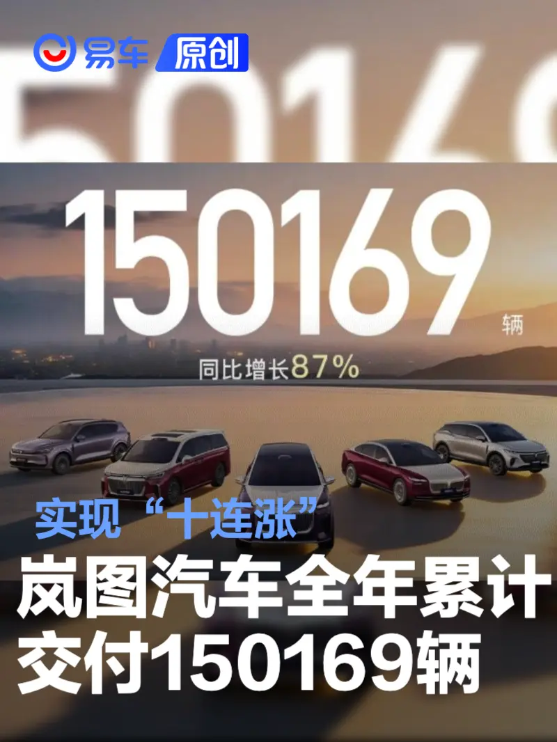 易车讯 1月1日,岚图汽车公布最新交付数据。2025年,岚图汽车全年累计交付150169辆,同比增长87%。