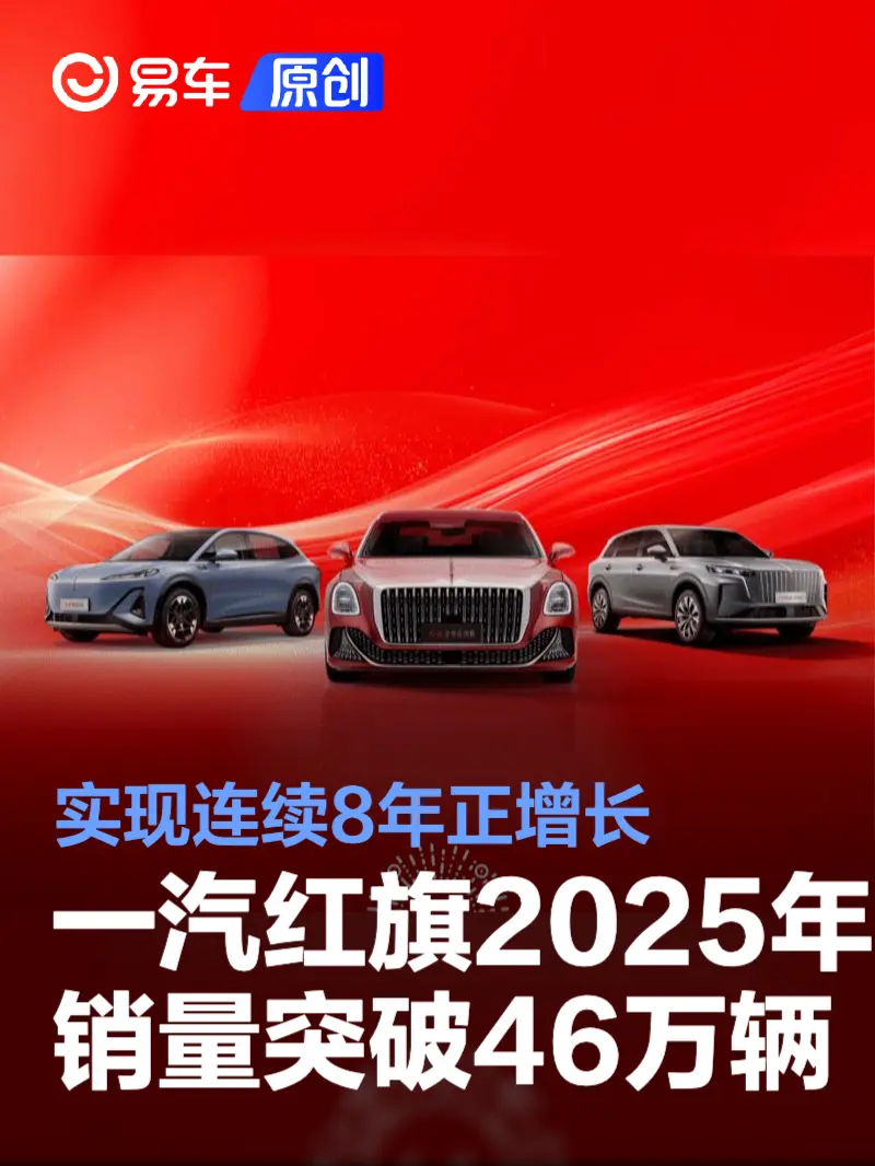 一汽红旗2025年销量突破46万辆 实现连续8年正增长 2026-01-01 10:28 来源:汽车产经网 作者:易车原创报道 举报 易车讯 2026年1月1日,红旗品牌发布最新销量成绩:2025年红旗品牌全年销量突破46万辆,同比增长11.7%,实现连续8年正增长。 其中,红旗新能源产品全年累计销量14.9万辆,同比增长29.8%。红旗金葵花产品销量1,404辆。