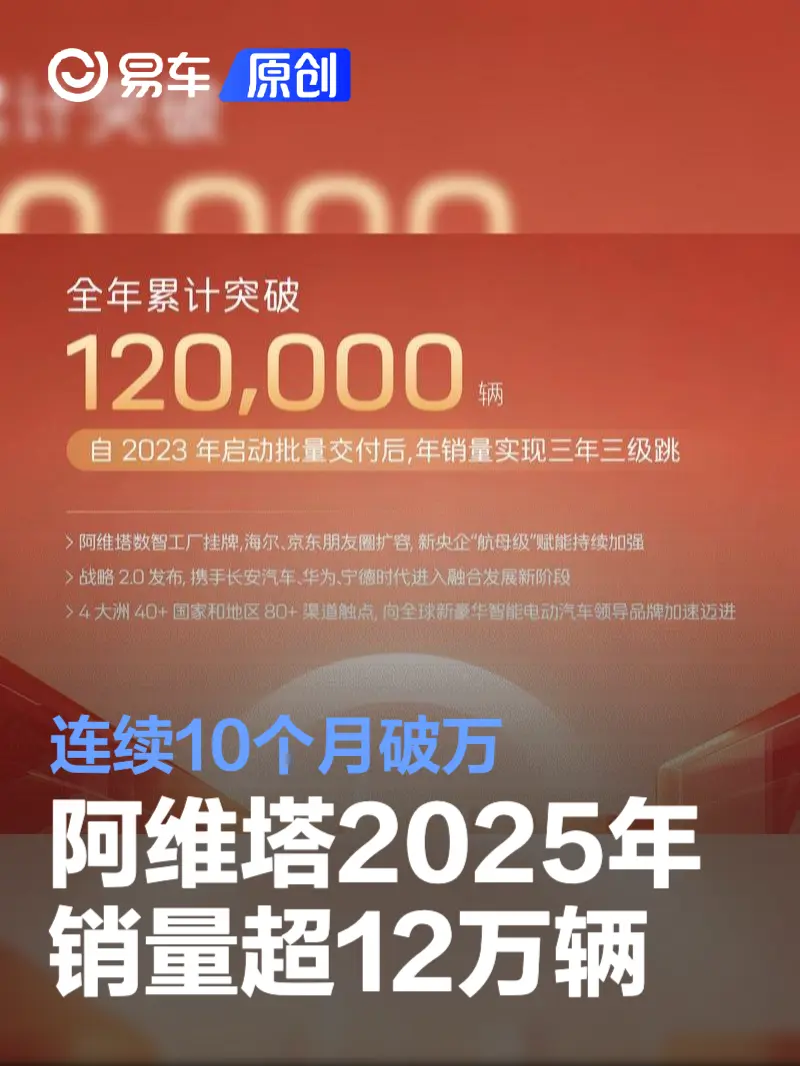 易车讯 1月1日,阿维塔科技公布最新销量数据。2025年12月,阿维塔科技销量10470辆,连续10个月销量破万;全年累计销量突破12万辆,自2023年启动批量交付后,销量连续迅猛增长,三年实现三级跳。