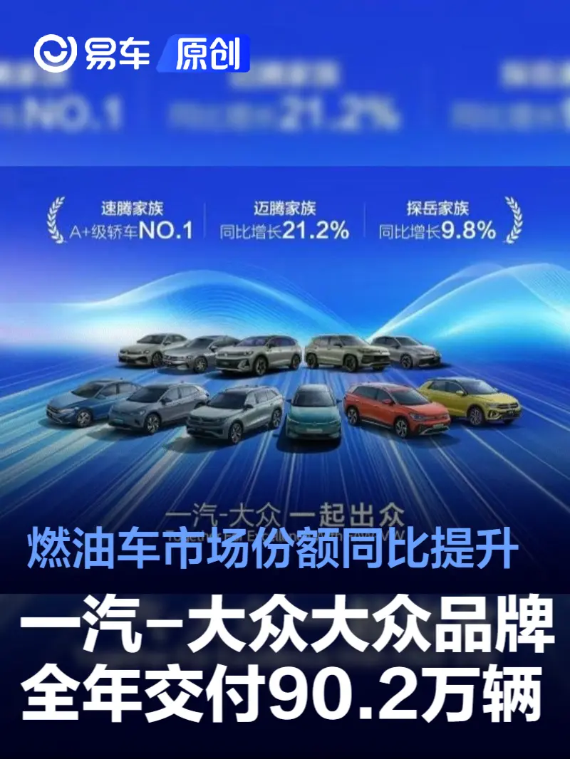 一汽-大众大众品牌全年交付90.2万辆 燃油车市场份额同比提升 2026-01-02 09:23 来源:汽车产经网 作者:易车原创报道 举报 易车讯 日前,一汽-大众正式发布2025年度业绩:全年整车销量1587065辆(含进口车),蝉联合资车企销量第一、燃油车销量第一。其中,一汽-大众燃油车市场份额同比增长0.9个百分点,创历史新高;大众品牌全年交付整车902066辆,燃油车市场份额同比提升0.6个百分点。 从具体车型来看,速腾家族全年销售251918辆;迈腾家族,全年销售215861辆,同比增长21.2%;探岳家族全年销量187142辆,同比增长9.8%。