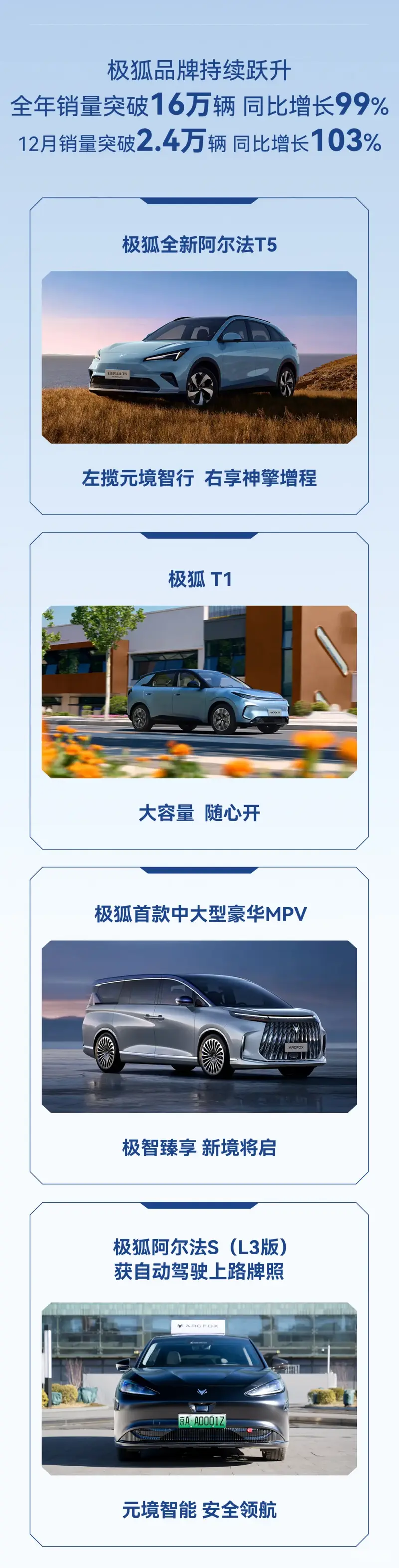 极狐品牌全年销量突破16万辆,连续3年实现销量翻番,12月单月销量突破2.4万辆,同比增长103%,持续巩固主流市场的价值标杆地位。