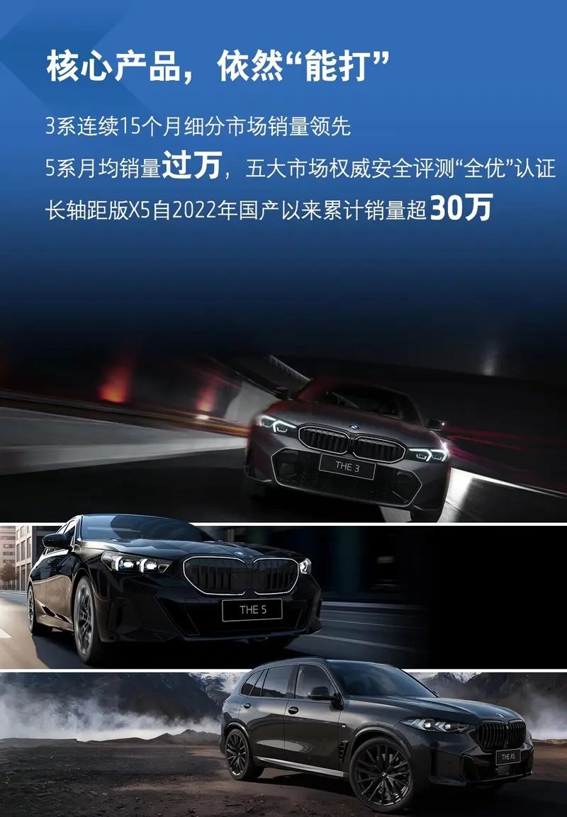 具体来看,宝马3系连续15个月细分市场销量领先,5系月均销量过万,长轴距版X5自2022年国产以来累计销量超30万辆。