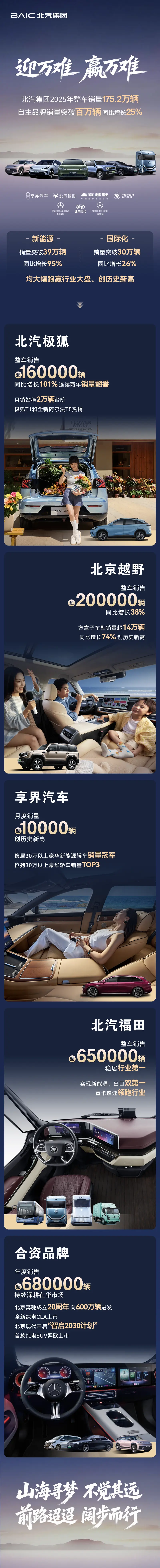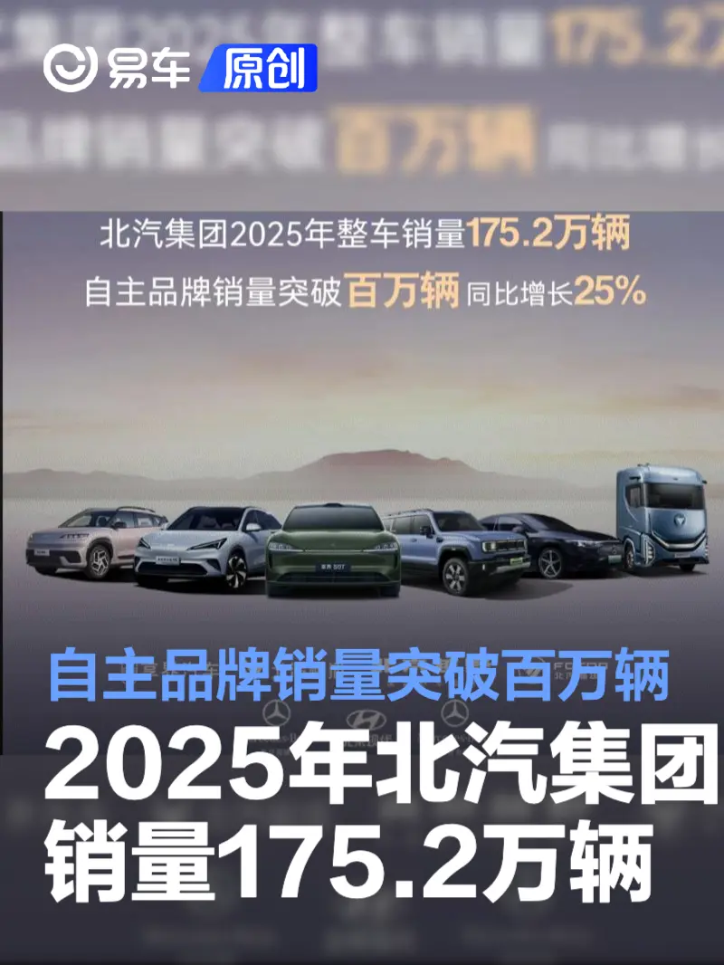 易车讯 1月9日,北汽集团公布最新销量数据。2025年,北汽集团整车销量175.2万辆,自主品牌销量突破百万辆,同比增长25%。其中,新能源销量突破39万辆,同比增长95%。