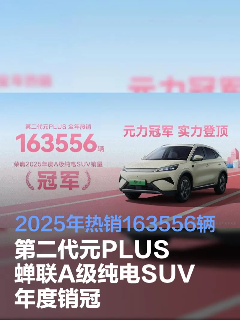 近日,乘联会发布2025年汽车批发量数据,第二代元PLUS凭借硬核的产品力和精准的市场定位,以163556辆的成绩强势斩获2025年度A级纯电SUV销量冠军。自2022年上市以来,用时14个月达成累销30万辆,元PLUS用一骑绝尘的冠军速度彻底颠覆了行业和消费者的认知,如今已连续四年斩获A级纯电SUV年度销冠,成为该细分市场的绝对王者。