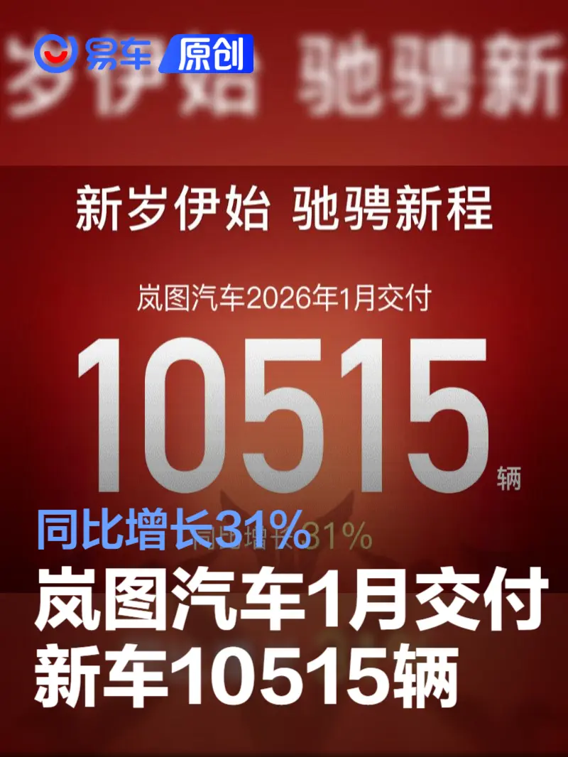 岚图汽车1月交付新车10515辆 同比增长31% 2026-02-01 15:53 来源:汽车产经网 作者:易车原创报道 举报 易车讯 2月1日,岚图汽车公布最新销量数据,2026年1月,岚图汽车交付新车10515辆,1月销量连续三年连升,同比增长31%。 此前,岚图汽车发布2026年新车规划,将推出四款全新车型,包括岚图泰山Ultra、岚图泰山X8、岚图FE(代号)及岚图珠峰(代号),覆盖SUV、FUV及MPV三大品类。岚图泰山Ultra将于2026年3月开启交付,岚图泰山X8计划于上半年上市,岚图FE(代号)将于今年中旬上市,岚图珠峰(代号)将于下半年上市。