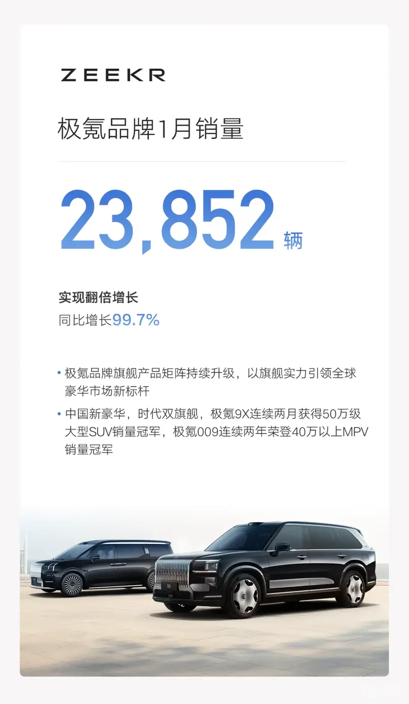 极氪品牌1月销量23852辆,实现翻倍增长,同比增长99.7%。极氪9X连续两月获得50万级大型SUV销量冠军,极氪009连续两年荣登40万以上MPV销量冠军。