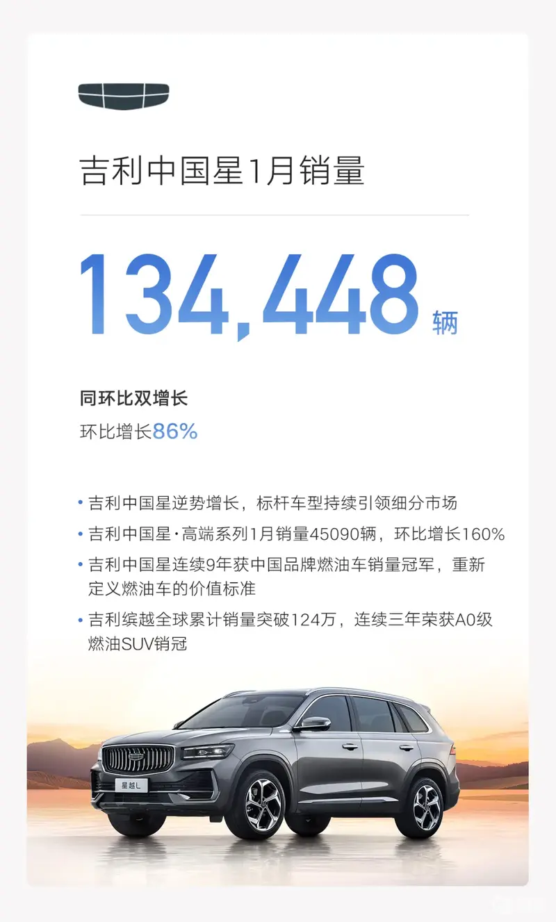 吉利中国星1月销量134448辆,同环比双增长,其中环比增长86%。吉利中国星·高端系列1月销量45090辆,环比增长160%,吉利中国星连续9年获中国品牌燃油车销量冠军;吉利缤越全球累计销量突破124万,连续三年荣获A0级燃油SUV销冠。
