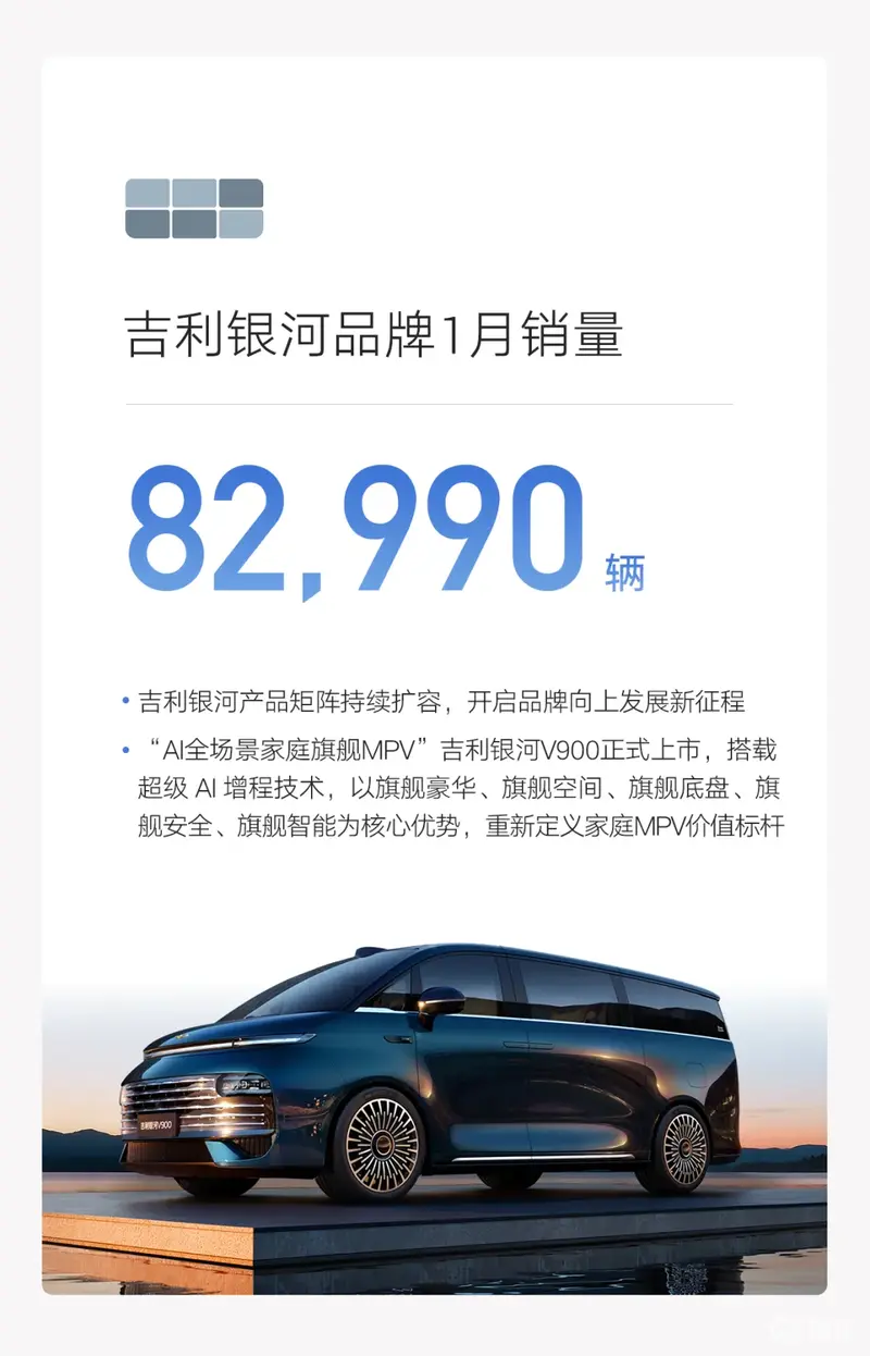 吉利银河品牌1月销量82990辆,吉利银河产品矩阵持续扩容,开启品牌向上发展新征程。