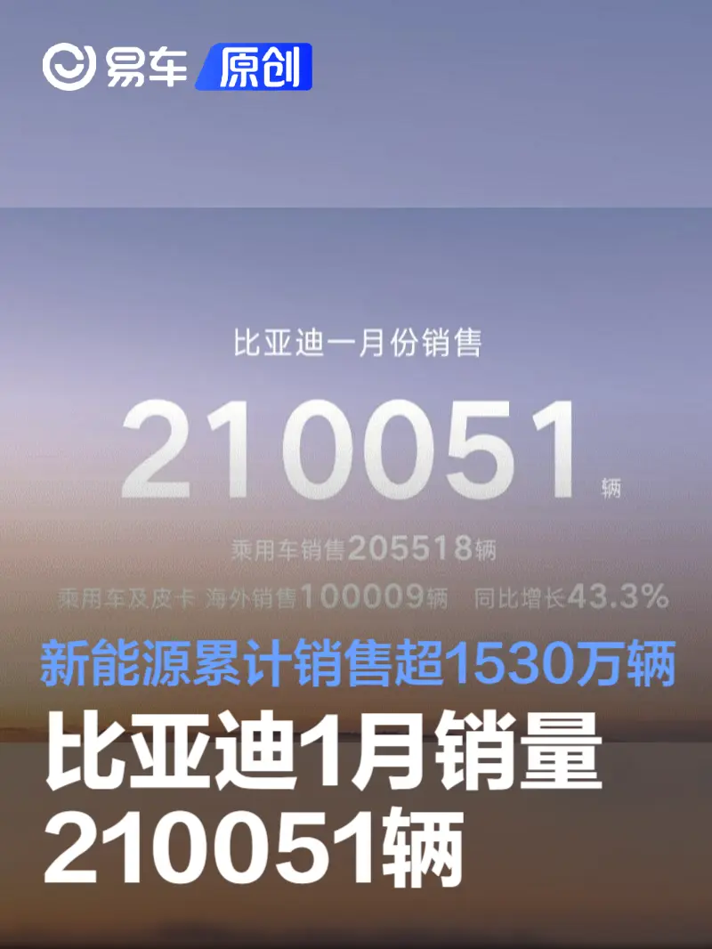 比亚迪1月销量210051辆 新能源累计销售超1530万辆 2026-02-01 19:51 来源:汽车产经网 作者:易车原创报道 举报 易车讯 2月1日,比亚迪汽车公布最新销量数据。2026年1月比亚迪销量210051辆,夺得中国新能源汽车销量冠军。其中乘用车销售205518辆;乘用车及皮卡、海外销售100009辆,同比增长43.3%;新能源累计销售超1530万辆。 具体品牌来看,比亚迪汽车王朝|海洋销量177522辆,方程豹销量21581辆,腾势销量6002辆,仰望销量413辆。