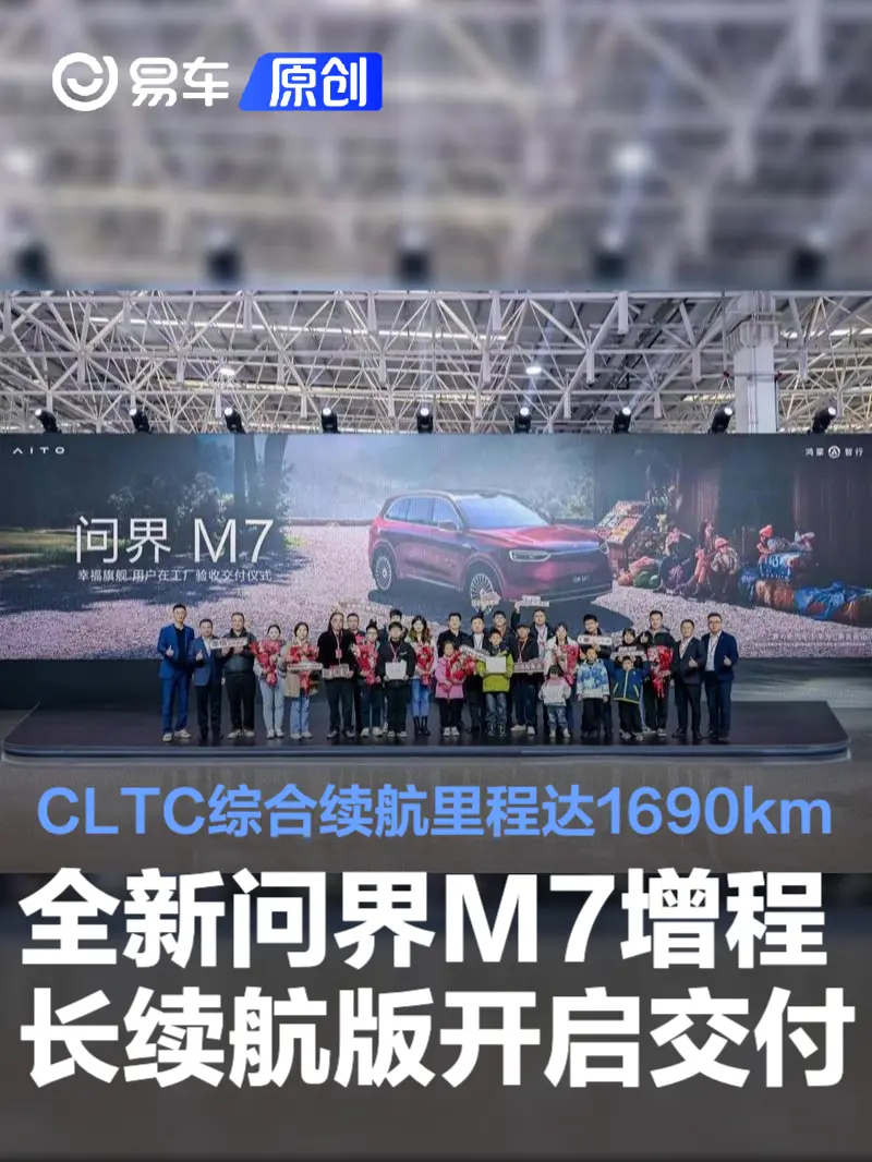 全新问界M7增程长续航版开启交付 CLTC综合续航里程达1690km 2026-02-04 11:40 来源:汽车产经网 作者:易车原创报道 举报 易车讯 2月3日,问界M7用户在工厂验收交付仪式在重庆赛力斯超级工厂(龙兴)举行。全新问界M7增程长续航版于1月13日正式发布,采用单电机后驱模式,后电机最大功率227kW,最大扭矩320N·m,CLTC纯电续航里程达到327km,CLTC综合续航里程达到1690km。 全国各地的全新问界M7增程长续航版准车主们走进赛力斯超级工厂生产车间,亲自参与车辆终检验收。 问界2025年全年累计交付新车超42万辆。今年1月,问界全系车型交付超4万辆,同比增长达83%,延续强劲增长势头。