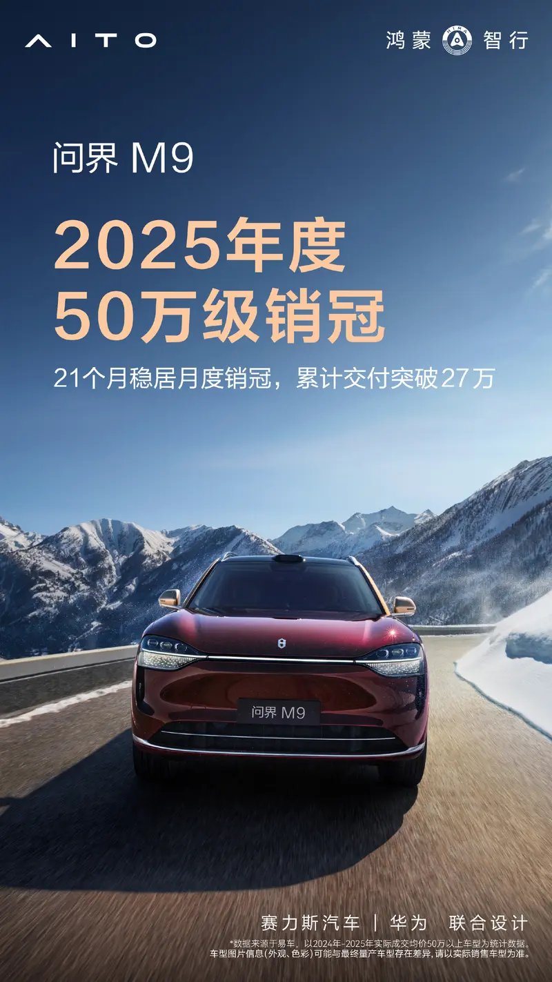 易车讯 鸿蒙智行日前宣布,问界M9累计交付超27万台,21个月稳居50万级销量冠军,销量、NPS(净推荐值)、保值率全维领先。