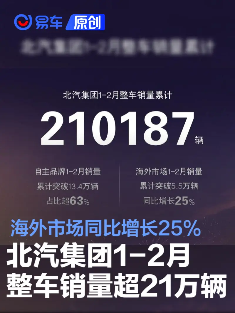 北汽集团1-2月整车销量超21万辆 海外市场同比增长25% 2026-03-03 19:36 来源:汽车产经网 作者:易车原创报道 举报 易车讯 3月3日,北汽集团发布最新销量数据。1-2月,北汽集团整车销量累计210187辆,其中自主品牌累计突破13.4万辆,占比超63%。 在海外市场中,北汽集团1-2月销量累计突破5.5万辆,同比增长25%