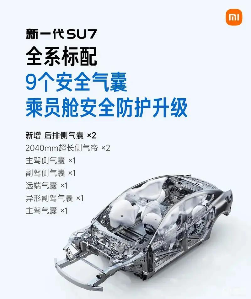 安全性方面,新一代SU7全系标配9个安全气囊,相比老款车型的7气囊新增了后排左右2个侧气囊。此外还全系标配了2200Mpa热成型钢车门防撞梁以及“内嵌式防滚架”。