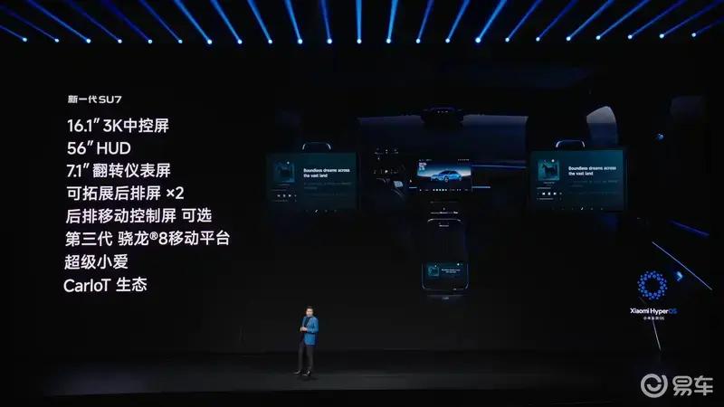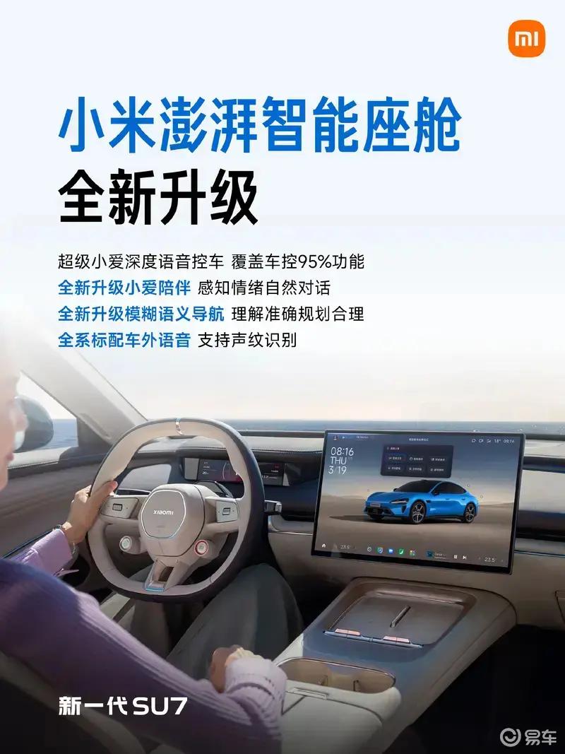 内饰方面,新一代小米SU7搭载了全面升级的小米澎湃智能座舱,车机系统流畅,开机快、启动快、升级快;超级小爱深度语音控车,覆盖车控95%功能;全新升级小爱陪伴功能,能感知情绪,自然对话;全新升级模糊语义导航,理解准确,规划合理;全系标配车外语音,支持声纹识别,好用且安全。新车搭载16.1英寸3K中控屏、56英寸HUD、7.1英寸翻转仪表屏、可拓展后排屏(2个)、后排移动控制屏(可选)等。