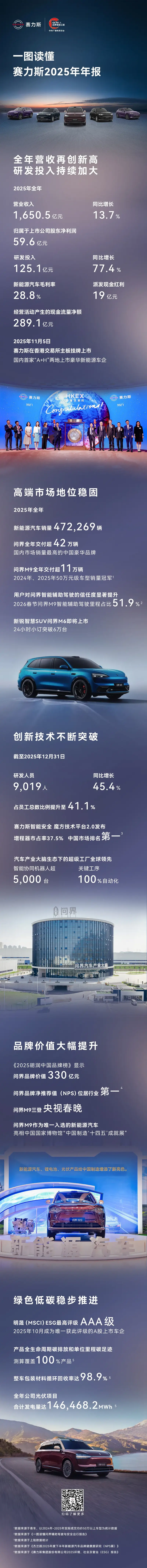 易车讯 日前,赛力斯集团公布2025年年报。2025年全年,赛力斯集团全年营收再创新高,研发投入持续加大。营业收入1650.5亿元,同比增长13.7%,归属于上市公司股东净利润59.6亿元,研发投入125.1亿元,同比增长77.4%。新能源汽车毛利率28.8%,派发现金红利19亿元,经营活动产生的现金流量净额289.1亿元。