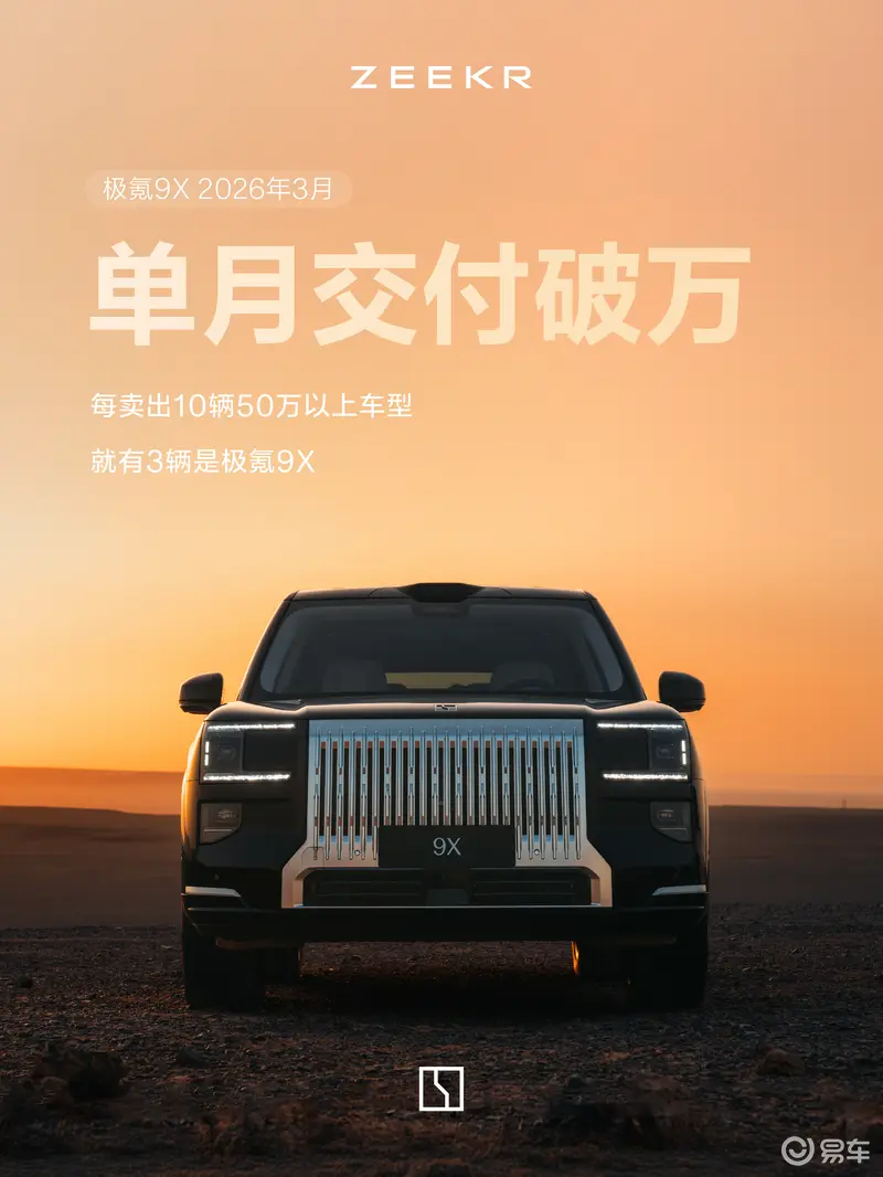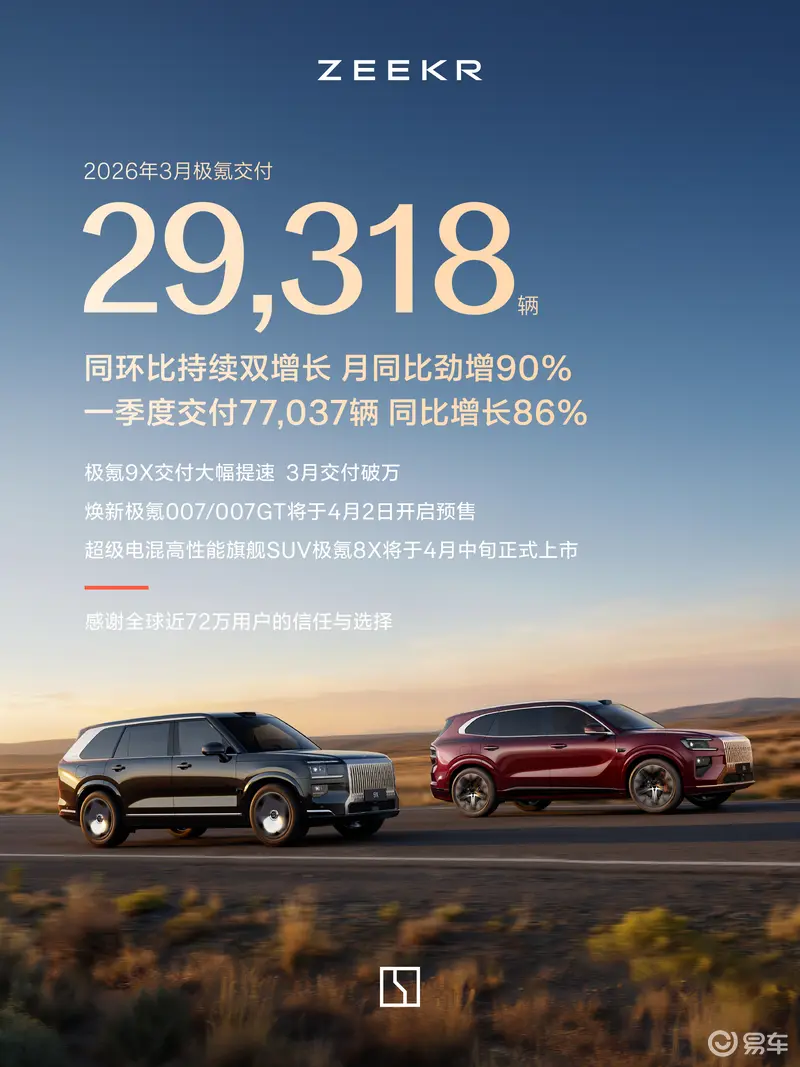 极氪9X交付大幅提速,3月交付破万;焕新极氪007/007GT将于4月2日开启预售;极氪001 五周年纪念版以及极氪007GT将于4月10日正式上市;极氪8X将于4月中旬正式上市。