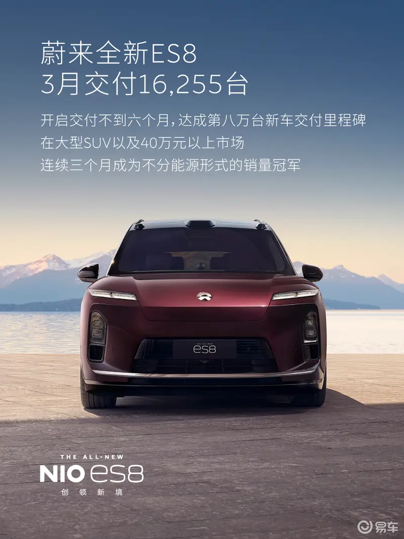 3月20日,蔚来全新ES8完成第80,000台新车交付,历时181天,3月份,全新ES8完成16255台新车交付。已连续三个月斩获「大型 SUV」不分能源形式、不分价格区间、不分座位数销量冠军。2026年4月,全新ES8继续加推专属限时旗舰礼遇。即日起至4月30日,订购蔚来全新ES8并成功锁单的用户,可享限时购置税补贴10,000元,5年「全域领航辅助 NOP+」免费使用权,以及飞航头等舱五件套。此外,蔚来还为全新ES8新推出了7年84期低息金融购车方案,首付低至20%起,还款期数84期,提前还款0违约金、0手续费,让金融购车做到真正的0套路。