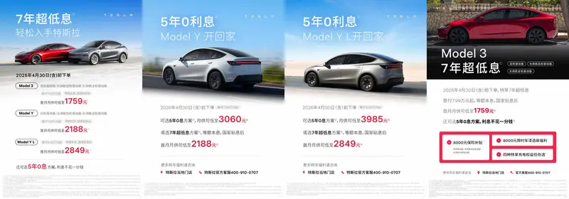 在中国市场销售政策方面,特斯拉宣布,4月30日前下单可享8000元限时车漆选装福利。同期,Model 3 和Model Y(全系)可选择首付7.99万元起的7年低息方案,国家贴息后首月月供分别低至1759元与2188元;Model Y L可选择首付9.99万元起的7年低息方案,首月月供可低至2849元。