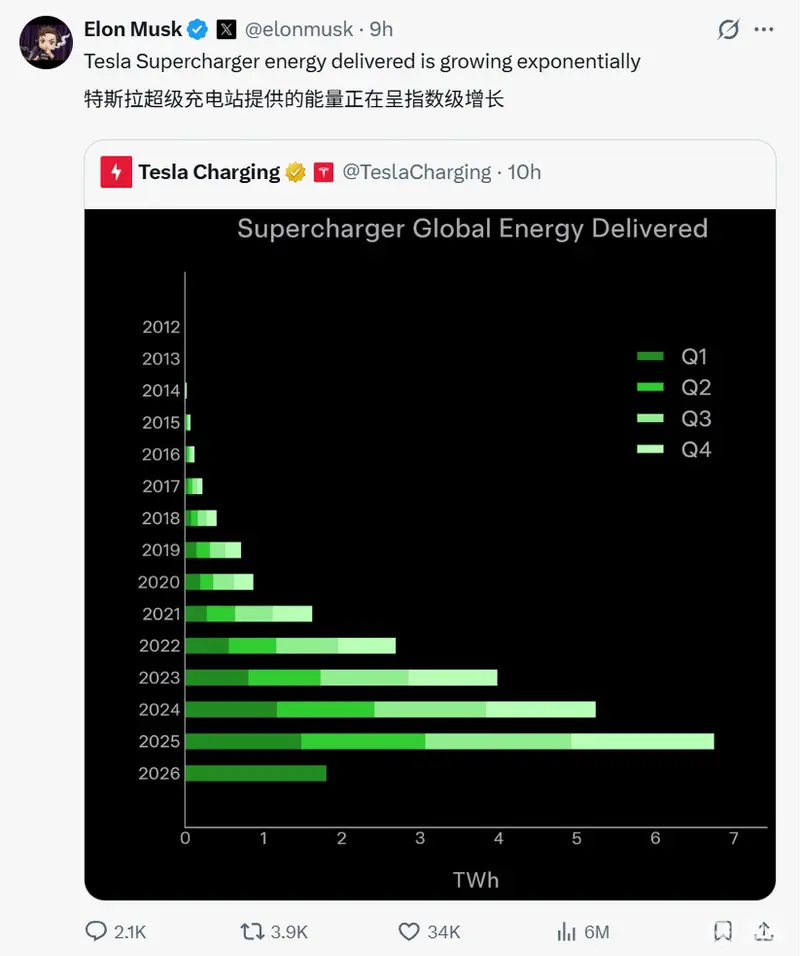 2026年第一季度交付报告显示,特斯拉储能装机量达到8.8吉瓦时。全球超充网络也在持续拓展中,为车主提供更省心的出行补能体验。据特斯拉官方数据,特斯拉超级充电站输出的能量正在逐年增长,2026年第一季度共输出1.8太瓦时的电力,同比增长22%。截至2026年3月,特斯拉拥有遍布全球的75000多根超级充电桩、8000多座超级充电站,是全球直流充电网络覆盖最广泛的品牌之一,充电桩实时可用率达99.95%。