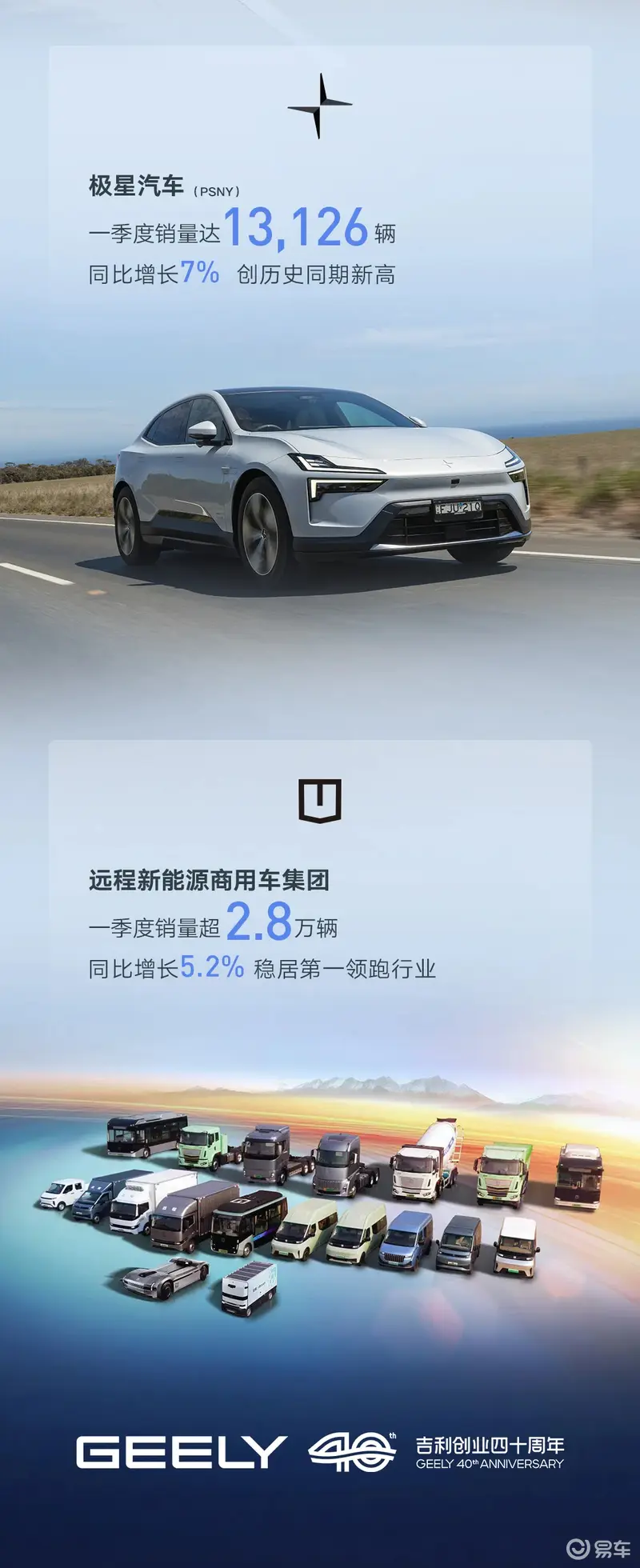 具体来看,吉利汽车一季度总销量709358辆,创同期新高。新能源销量369059辆,同比增长9%,渗透率52%;海外出口销量203024辆,同比增长126%。吉利中国星一季度销量31.18万辆;吉利银河一季度销量超23.88万辆;领克品牌一季度销量超8.16万辆;极氪品牌一季度交付7.7万辆;沃尔沃汽车一季度销量15.3万辆,新能源渗透率达47.3%;宝腾汽车一季度销量4.9万辆;极星汽车一季度销量13126辆;远程新能源商用车集团一季度销量超2.8万辆。