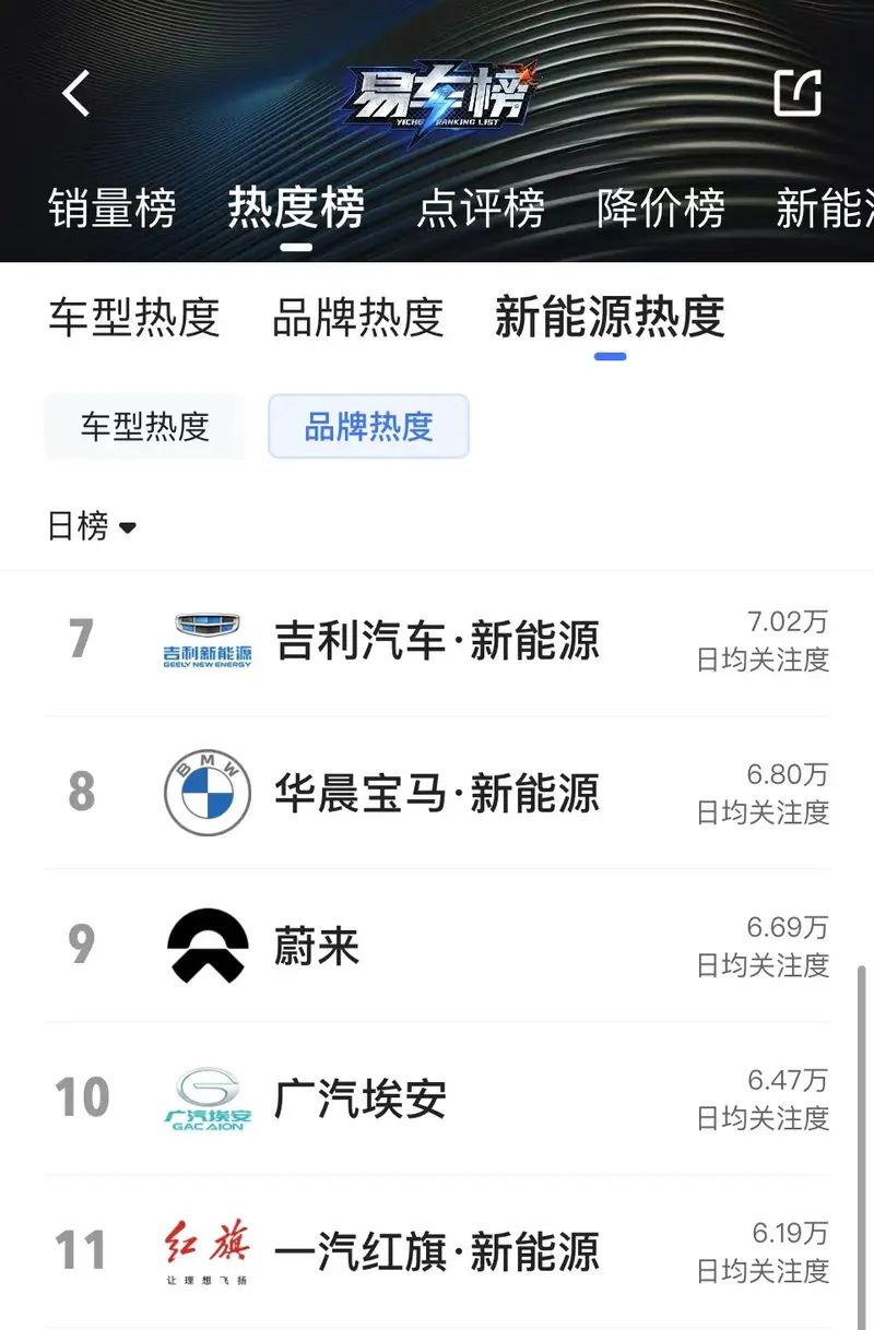 根据易车App“热度榜”数据,吉利新能源在同级别竞品中排名第7,日均关注度7.02万。如需更多数据,请到易车App查看。