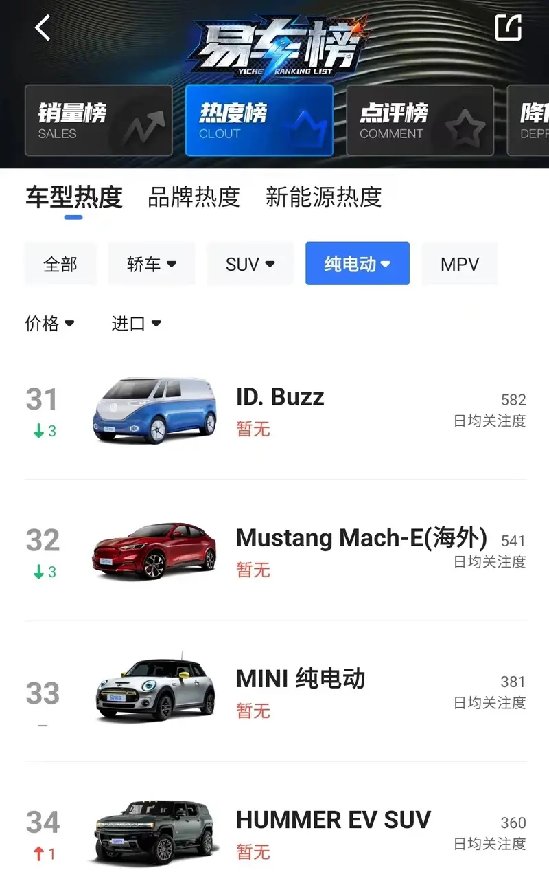 根据易车App“热度榜”显示的数据,大众ID.BUZZ排名第31位。如需更多数据,请到易车App查看。