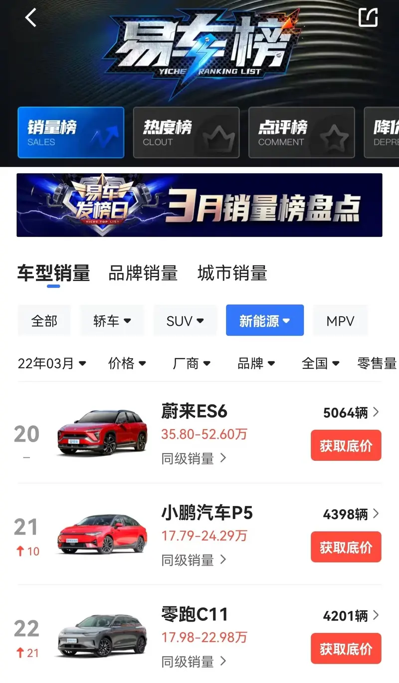 根据易车App“新能源车型销量榜”显示的数据,小鹏P5 3月共售出4398辆,位列榜单第21名。如需更多数据,请到易车App查看。