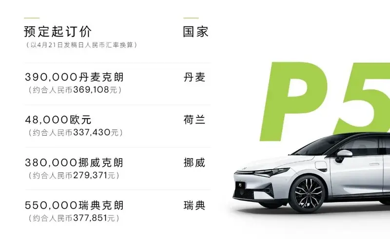 易车讯 近日,小鹏汽车公布了小鹏P5在挪威、丹麦、荷兰和瑞典市场的预计起订价。丹麦市场为390,000丹麦克朗起、荷兰市场为48,000欧元起、挪威市场为380,000挪威克朗起、瑞典市场为550,000瑞典克朗起。以今日人民币汇率换算,约合27.93-37.78万元。同时,品牌直营体验店目前均接受看车咨询并试驾体验等服务。