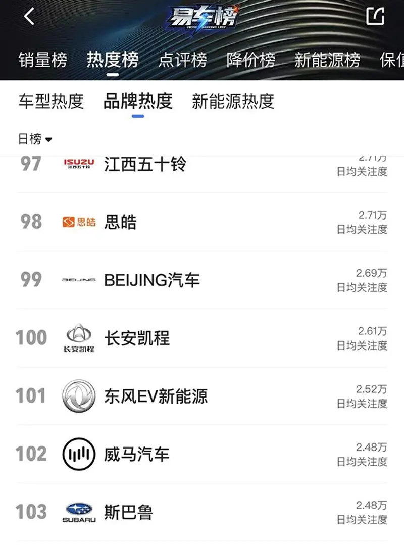 根据易车App“热度榜”数据,威马汽车品牌的热度排名第102位,如需更多数据,请到易车App查看。