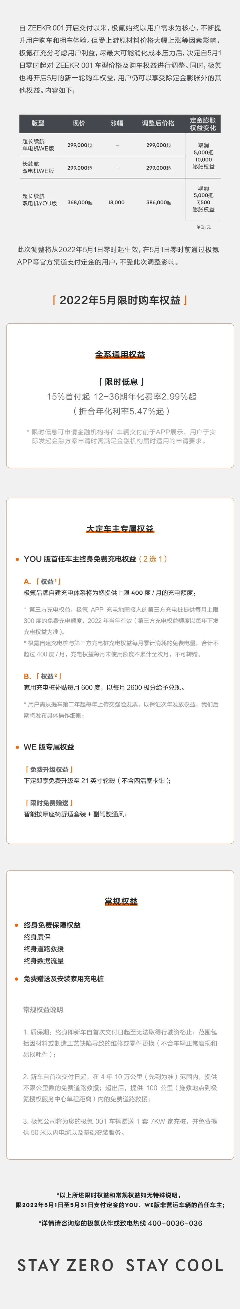 易车讯 日前,极氪官方发布了ZEEKR 001价格及5月购车权益调整公告。根据公告内容表示,此次价格和购车权益调整原因主要是上游原材料价格大幅上涨。此次调整自5月1日零时起施行,而5月1日前通过极氪APP等官方渠道支付定金的用户不受此次调整影响。