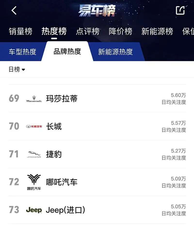 根据易车App“热度榜”数据,哪吒汽车品牌的热度排名第72位,如需更多数据,请到易车App查看。