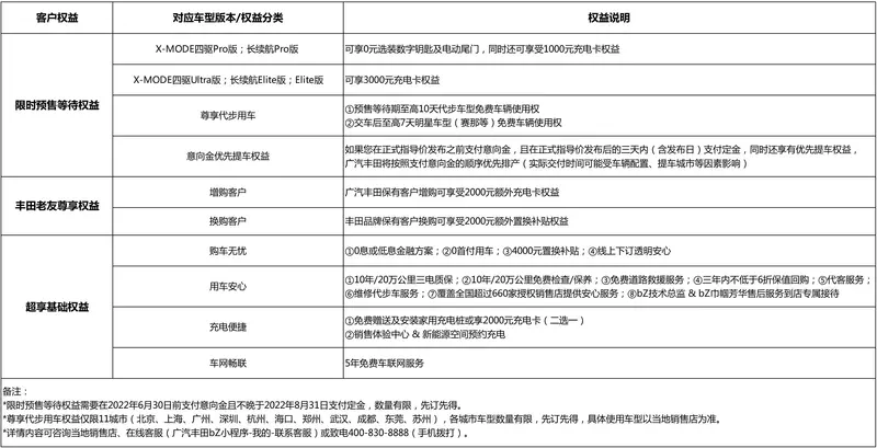 除此之外,广汽丰田bZ4X在预售期间还为车主提供了包括:限时预售等待权益、丰田老友尊享权益、超享基础权益等一系列购车福利。