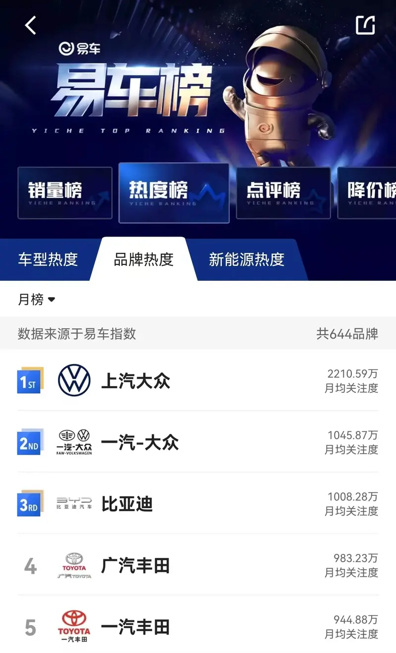 根据易车App“品牌热度榜”数据,广汽丰田月均关注度983.23万,位列第4名。如需更多数据,请到易车App查看。