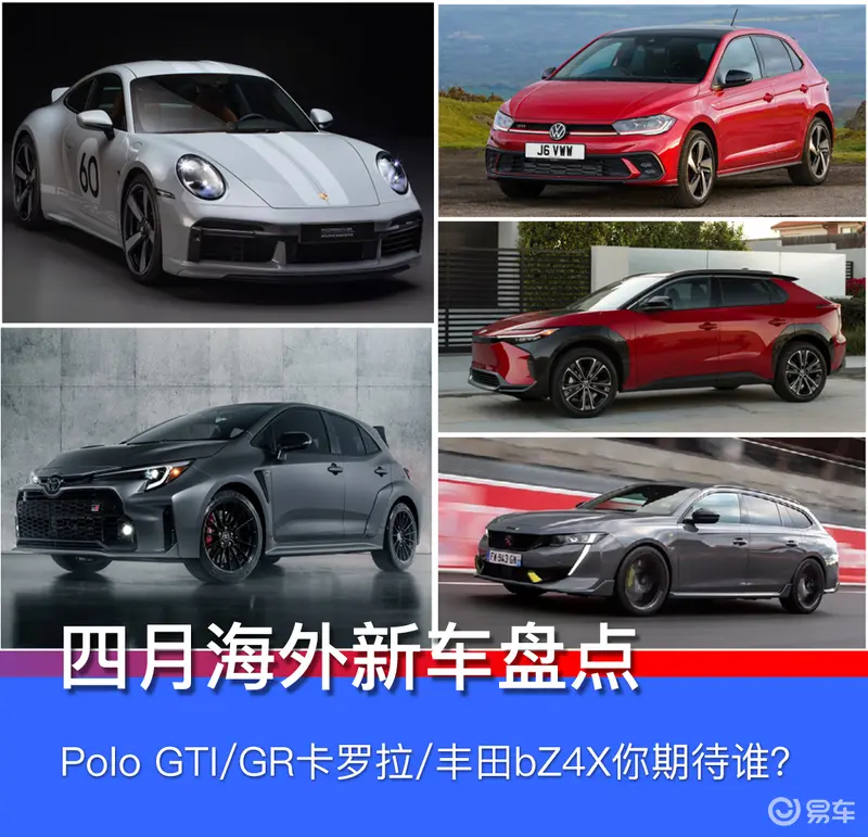易车原创 进入四月,海外新车市场依然火热,但是大众级别的家用车不多,主要以高端豪车和小众个性车为主。本文就带大家看一批运动类的车型,包括大众Polo GTI、丰田GR卡罗拉、丰田首款纯电SUV bZ4X、标致508 PSE和保时捷911 2023限量版等车型,看看它们各自有着怎样的性能特色,有没有值得你期待的新车。
