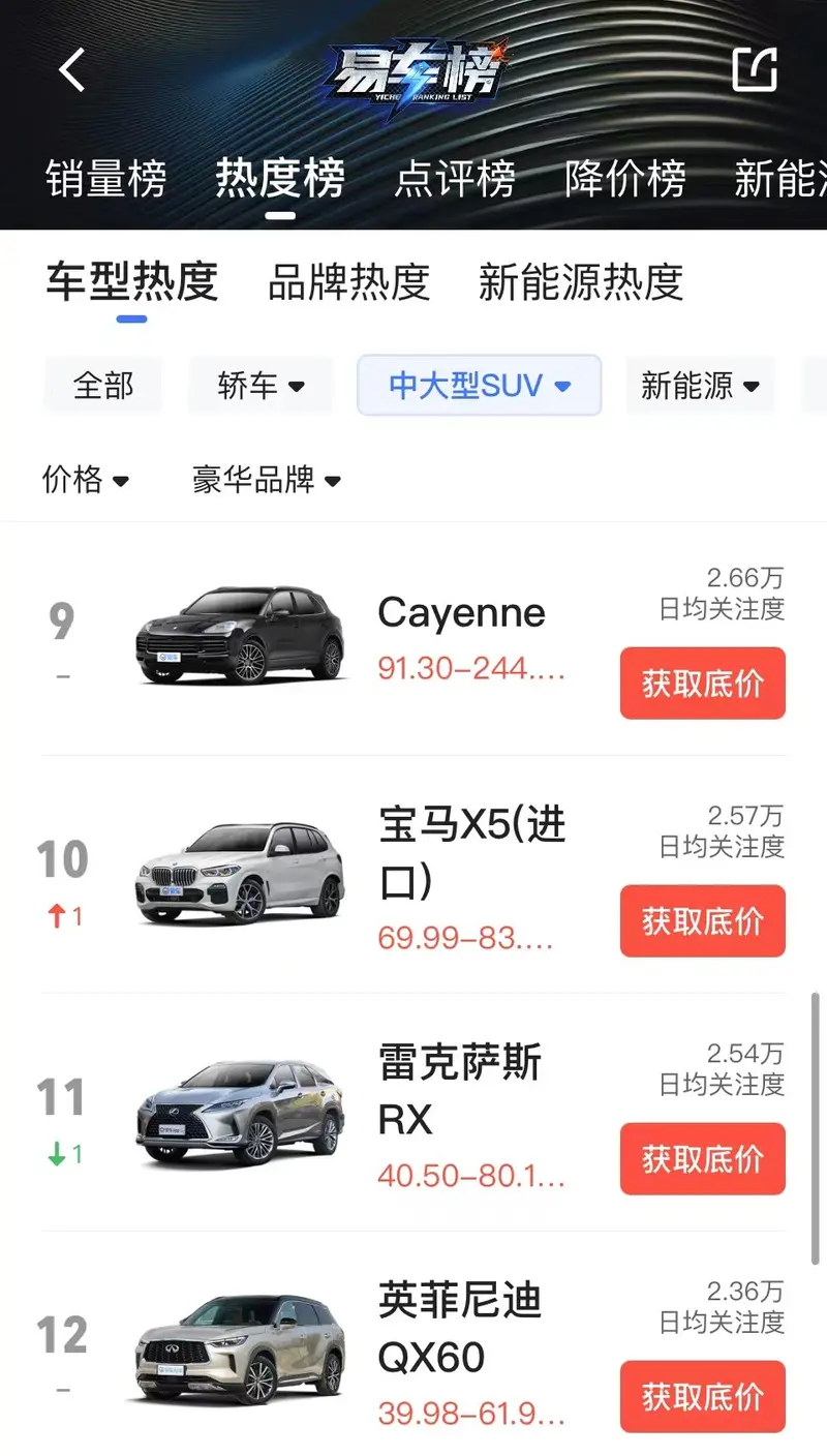 根据易车App“人气榜”数据,保时捷Cayenne在豪华品牌同级别竞品中排名第9,日均关注度2.66万。如需更多数据,请到易车App查看。
