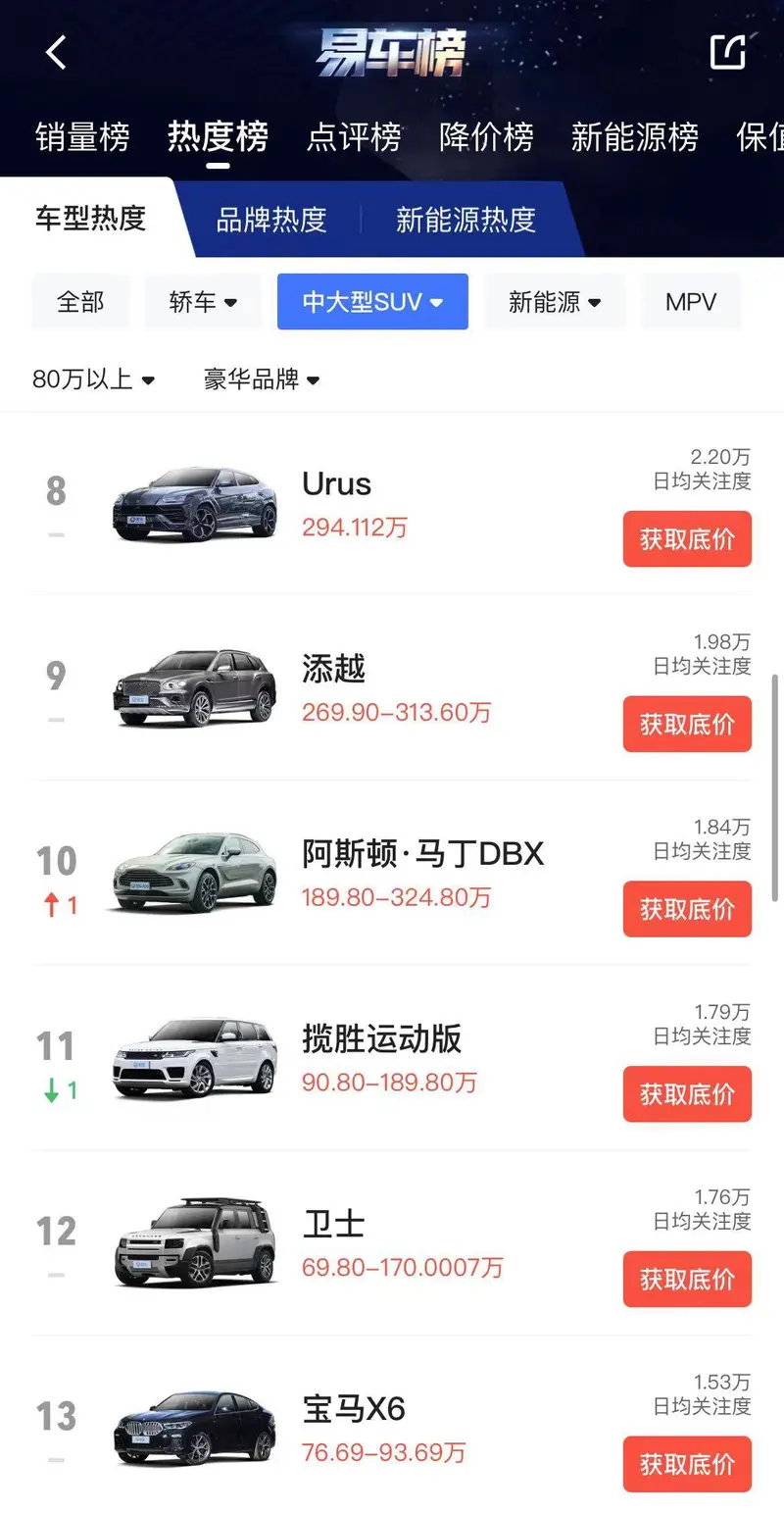 根据易车App“热度榜”数据,添越的日均关注度为1.98万,在同级别竞品中排名第9位,如需更多数据,请到易车App查看。