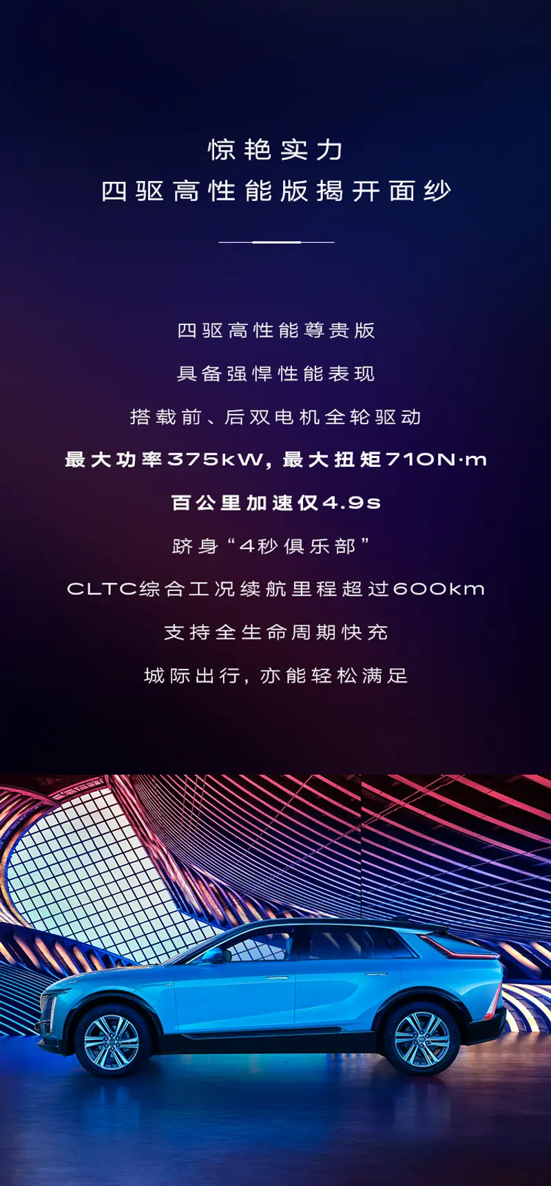 以“性能”为主打的四驱高性能尊贵版采用四轮驱动形式,搭载前、后两部永磁同步电机,可实现最大功率375kW,电机最大扭矩710N·m,百公里加速仅4.9s。同时,四驱高性能尊贵版的CLTC续航里程也在600km以上,支持全生命周期快充。