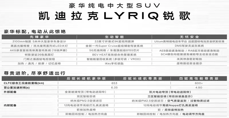新车于去年正式开启预售,首发车型后驱长续航豪华版预售价格43.97万元,新车订金为1190元。作为凯迪拉克品牌旗下首款纯电动车,定位于豪华纯电动中大型SUV的国产凯迪拉克LYRIQ基于Ultium奥特能纯电动平台打造而来,后驱版CLTC工况续航里程超过653km。