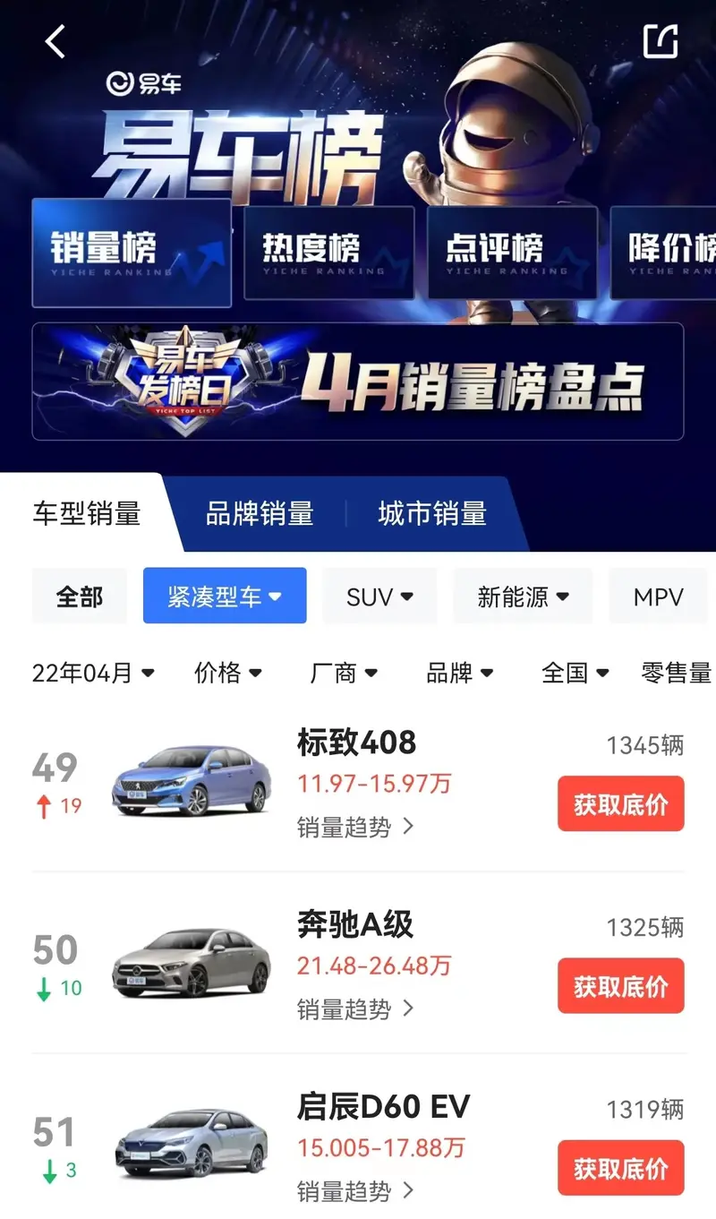 根据易车App“紧凑型车销量榜”数据,东风标致408 4月销量为1345辆,位列排行榜第49名。如需更多数据,请到易车App查看。