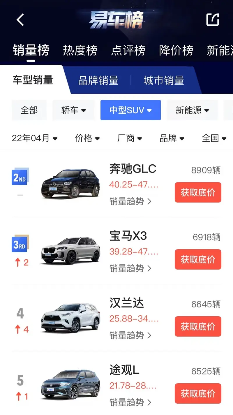 作为参考,从最早的GLK、GLC到GLC L及AMG车型,均有引入或本土生产销售。根据易车App“销量榜”数据,奔驰GLC在中型SUV同级别竞品中排名第2,4月销量8909辆。如需更多数据,请到易车App查看。