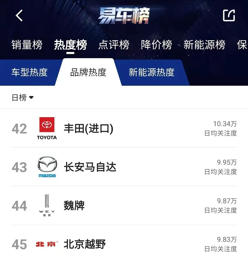 根据易车App“热度榜”显示的数据,丰田(进口)排名第42位。如需更多数据,请到易车App查看。