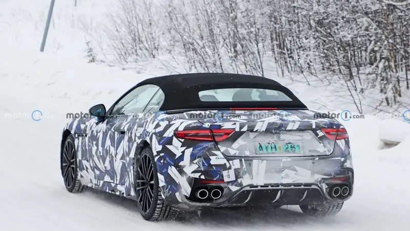 目前,新车正在极寒环境下进行相关测试,伪装贴纸非常具有玛莎拉蒂的特点。车顶为黑色织物材质,在关闭状态下仍提供一个可视的尾窗。