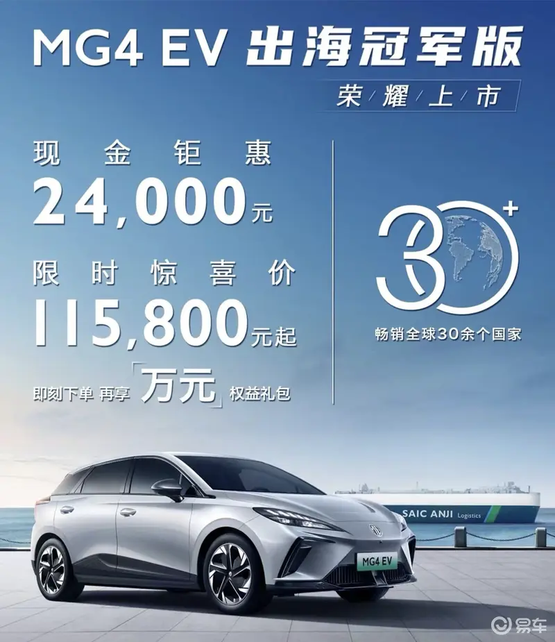 易车讯 9月7日,MG4 EV出海冠军版正式上市,限时惊喜价售11.58万元。新车上市即可享限时现金钜惠24000元,即刻下单可再享包括三电终身质保、免费充电桩在内的万元权益礼包。