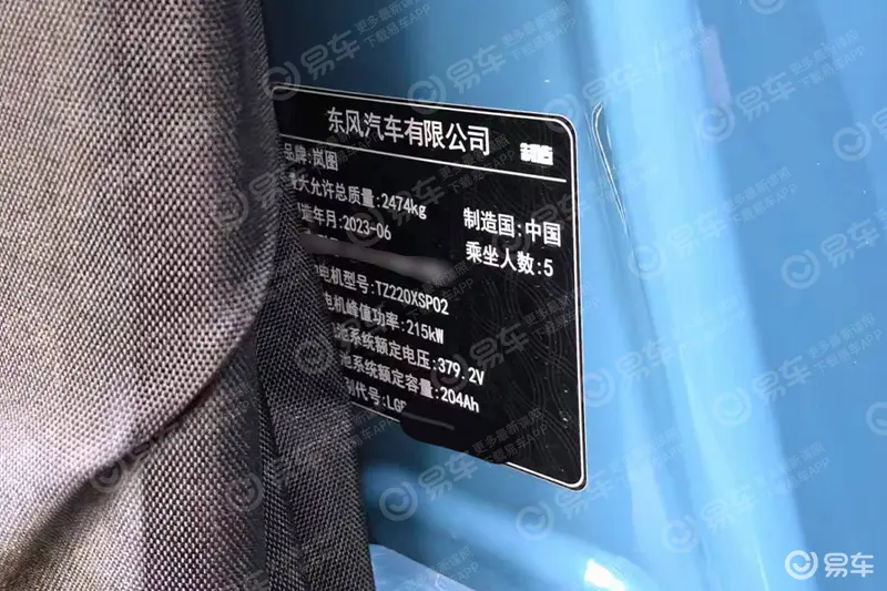 动力方面,新车或拥有插电混动和纯电两种动力形式。根据铭牌上的信息了解到,新车总质量为2474kg,电机峰值功率为215kW,额定电压为379.2V,电池额定容量为204Ah。