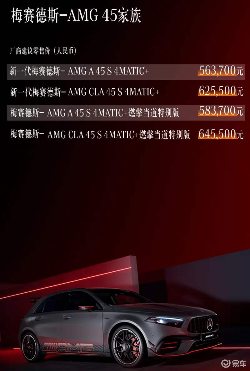 易车讯 在2023年广州国际车展梅赛德斯奔驰公布了新款AMG CLA 35和45家族的售价,其中AMG CLA 35 4MATIC售45.43万元;AMG CLA 45 S 4MATIC+售62.55万元,AMG CLA 45 S 4MATIC+燃警当道特别版售64.55万元。