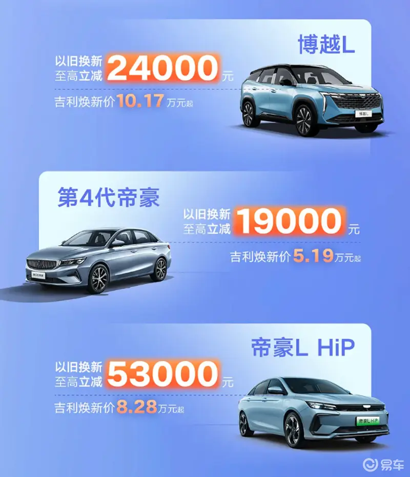 博越L以旧换新至高立减24000元,焕新价10.17万元起;第四代帝豪以旧换新至高立减19000元,焕新价5.19万元起;帝豪L HiP以旧换新至高立减53000元,焕新价8.28万元起。