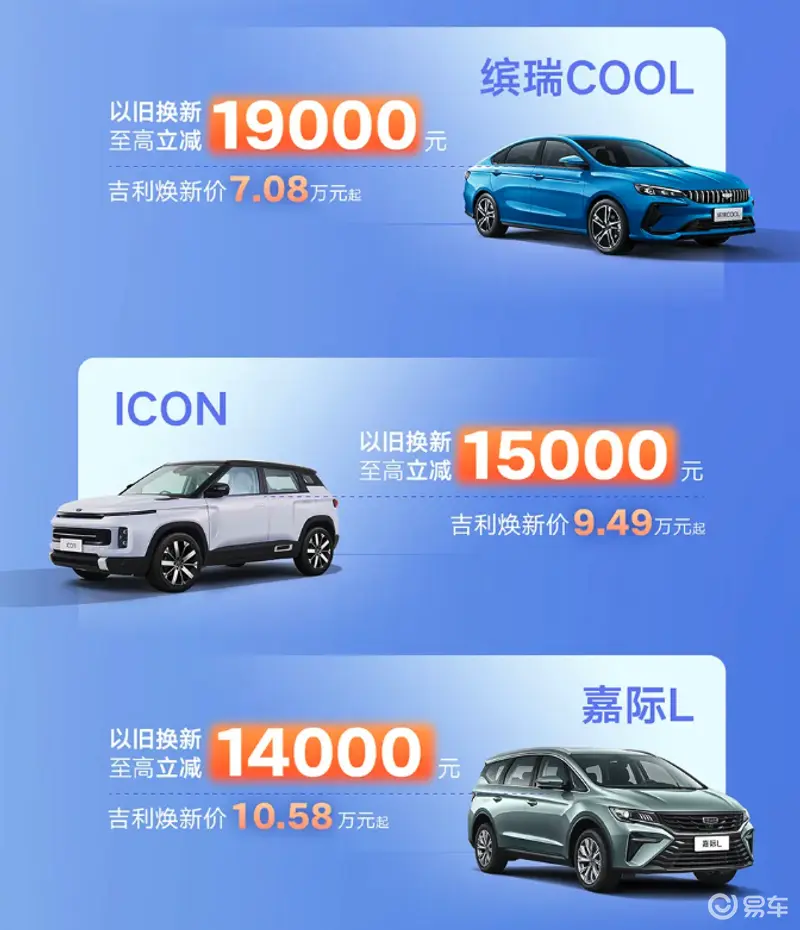 细分车型来看,星越L系列车型以旧换新至高立减30000元,焕新价11.77万元起;星瑞系列以旧换新至高立减22000元,焕新价8.67万元起;博越COOL以旧换新至高立减21000元,焕新价7.98万元起.