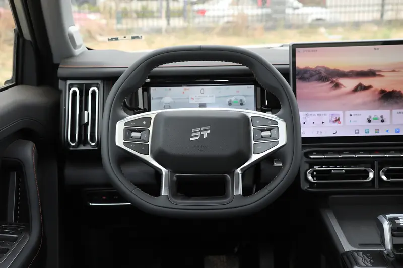 山海T1四驱版的内饰同样也和两驱版相同,在对称的内饰设计中间是一块15.6英寸的中控大屏,内置高通骁龙8155芯片。因为四驱版车型搭载了捷途XWD全自动智能四驱系统,所以挡杆后方的驾驶模式旋钮上是有现在是7+X共八种越野模式,其中特设的X一键越野模式可以自动识别不同路况并切换相应的四驱模式,实现动力的智能分配。