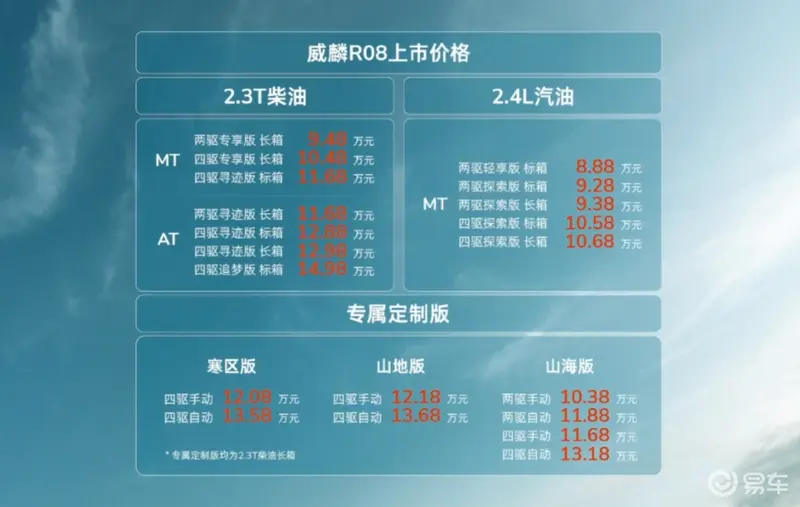 动力方面,威麟R08推出2.4L汽油版和2.3T柴油版两种动力,汽油版匹配5MT变速箱,柴油版匹配6MT和8AT变速箱,并分别提供两驱和四驱版车型。