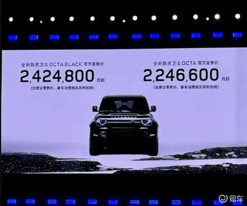 易车讯 9月26日,我们从官方获悉路虎卫士OCTA正式上市,推出普通版与OCTA BLACK两种版本,路虎卫士OCTA建议零售价为199.9万元起,直售价224.66万元起(含建议零售价、豪车消费税及其附加税),路虎卫士OCTA BLACK的建议零售价为215.8万元起,直售价为242.48万元起(含建议零售价、豪车消费税及其附加税)。新车基于卫士110打造,搭载来自宝马M的4.4T双涡轮增压发动机,并加入48V轻混系统,最大功率达到635马力。